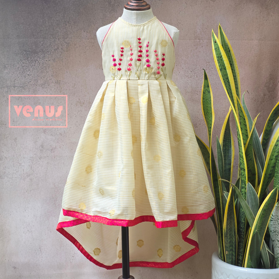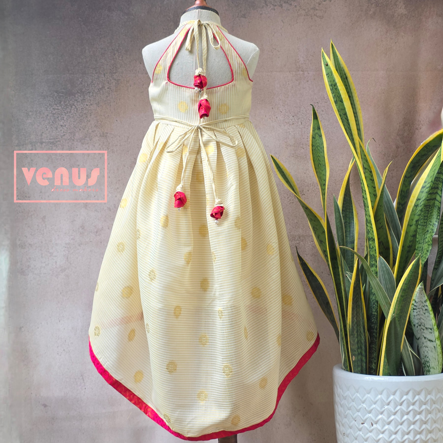 “Apsara – woven in cream and kissed with golden light, this festive dress carries the aura of celestial beauty. Graceful as a divine dance, it shines with timeless elegance for every celebration.”