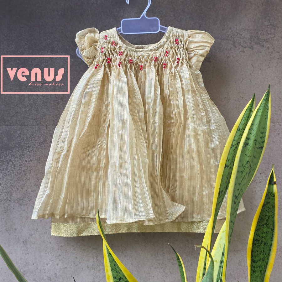 A delicate newborn smocked dress in a soothing chiku shade, crafted with love for the tiniest hearts. Featuring gentle gathers, intricate hand-smocking, and soft cotton lining—perfect for cozy cuddles and quiet charm.