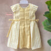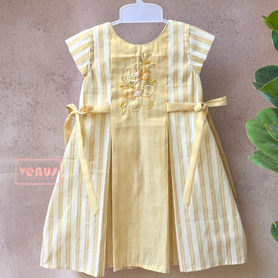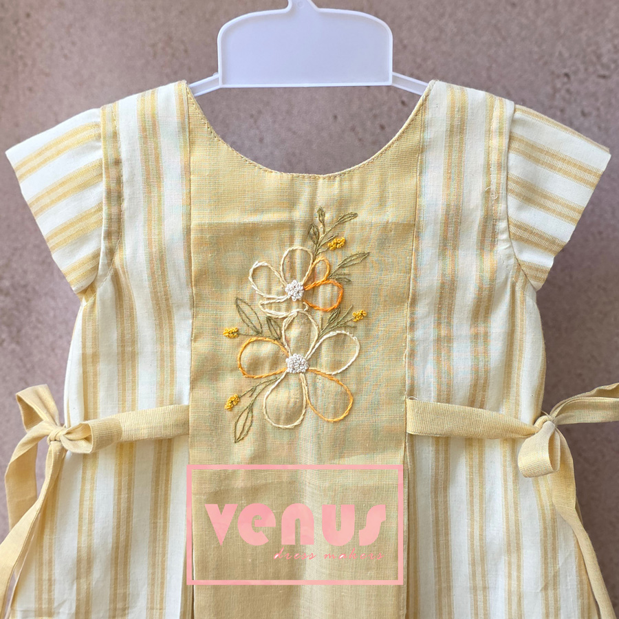 A graceful blend of tradition and charm, this dress is crafted in a soothing golden hue that reflects timeless elegance. The delicate hand-embroidered floral motif adds a touch of artisanal beauty, while the soft striped panels bring a gentle, playful contrast. With side tie-ups for a perfect fit, it is ideal for festive moments and special little celebrations.