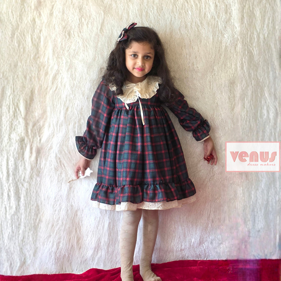 “Wrapped in festive charm, this plaid frock whispers warmth and wonder. The soft lace collar and gentle frills add a touch of vintage grace — paired with a matching hair clip for the perfect Christmas twirl.”