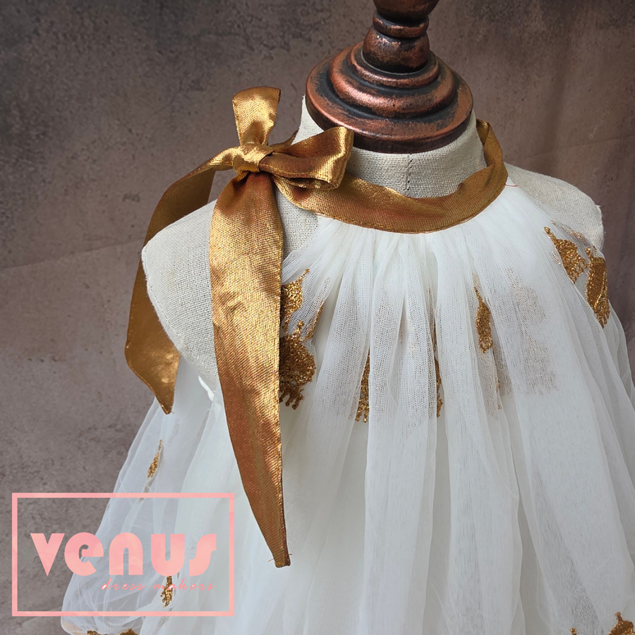 ‘Jimikki’ – A charming cream-colored net dress designed with playful elegance. With shoulder knots and a soft flare, this dreamy outfit blends comfort with festive flair, perfect for little stars to shine on special occasions.