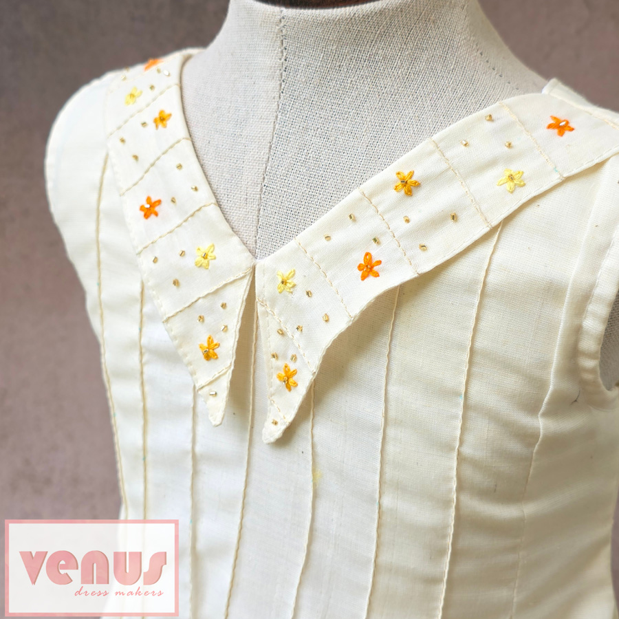 “Kasavu” is a timeless Onam frock in classic cream, adorned with a rich gold border and delicate hand embroidery along the V-neck. Designed for girls up to 10 years, (Material for sleeves are provided inside if needed) —perfect for festive charm and tradition.