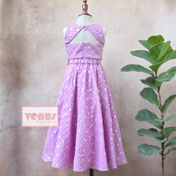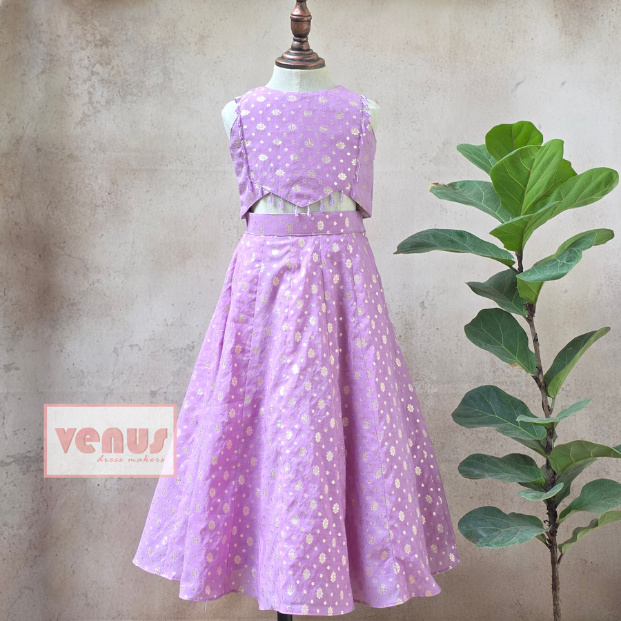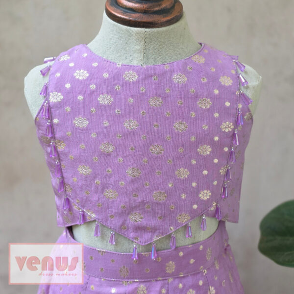 “Lavanya glows in lilac charm, adorned with golden blooms that shimmer bright. The tasseled top sways with every move, pairing gracefully with the flared skirt – a perfect blend of festivity and delight.”