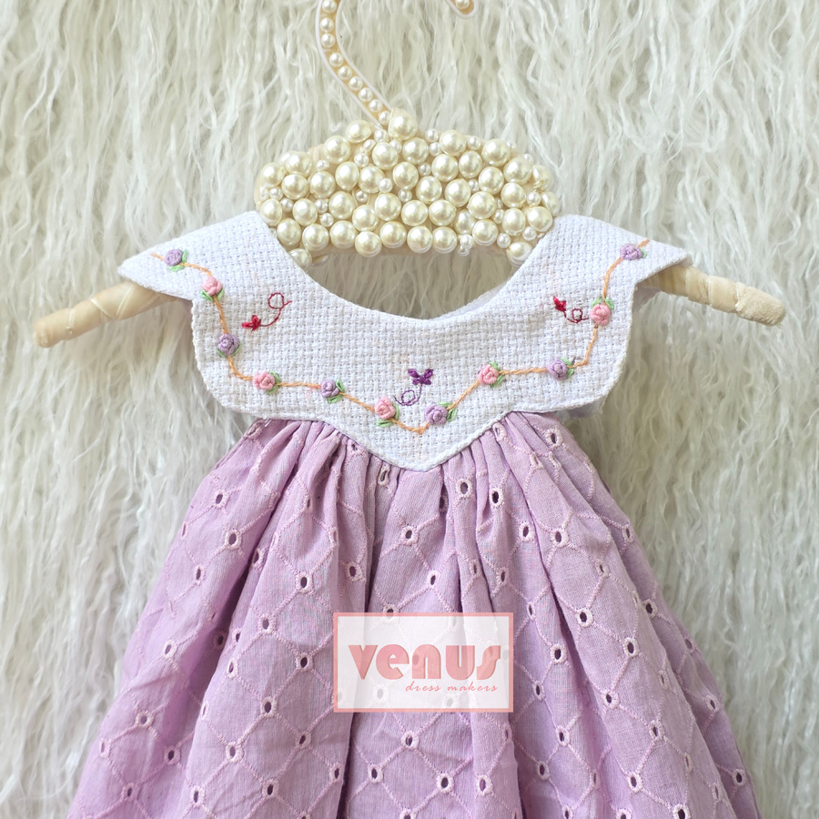 Lavender – A dreamy lilac dress crafted in soft eyelet cotton, featuring delicate hand embroidery on the neckline and a beautifully flared silhouette. Light, elegant, and perfect for your little one’s special summer moments. 🌸✨