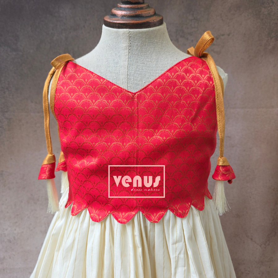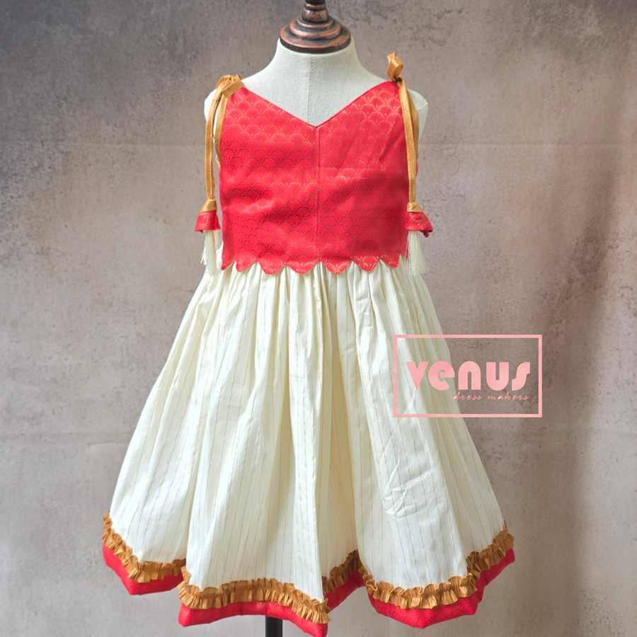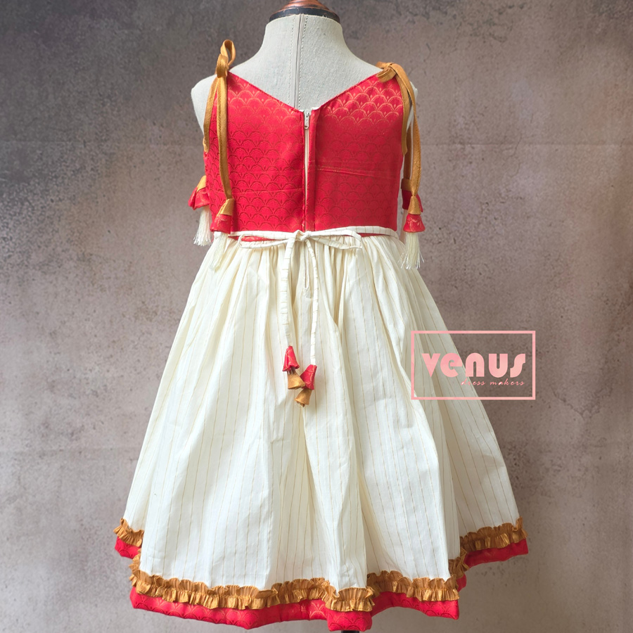 A vibrant red and cream-colored outfit for kids, featuring a traditional Kerala style. Perfect for Onam celebrations!