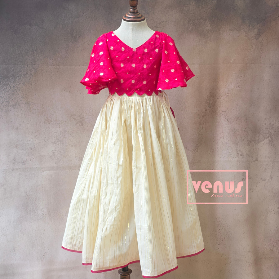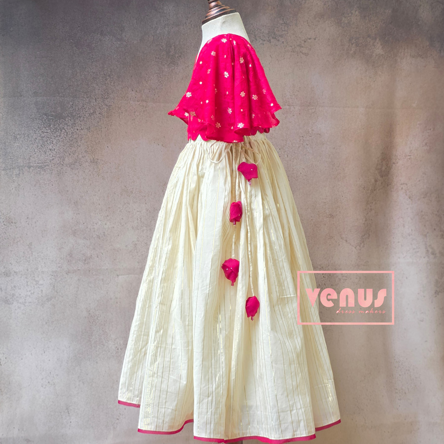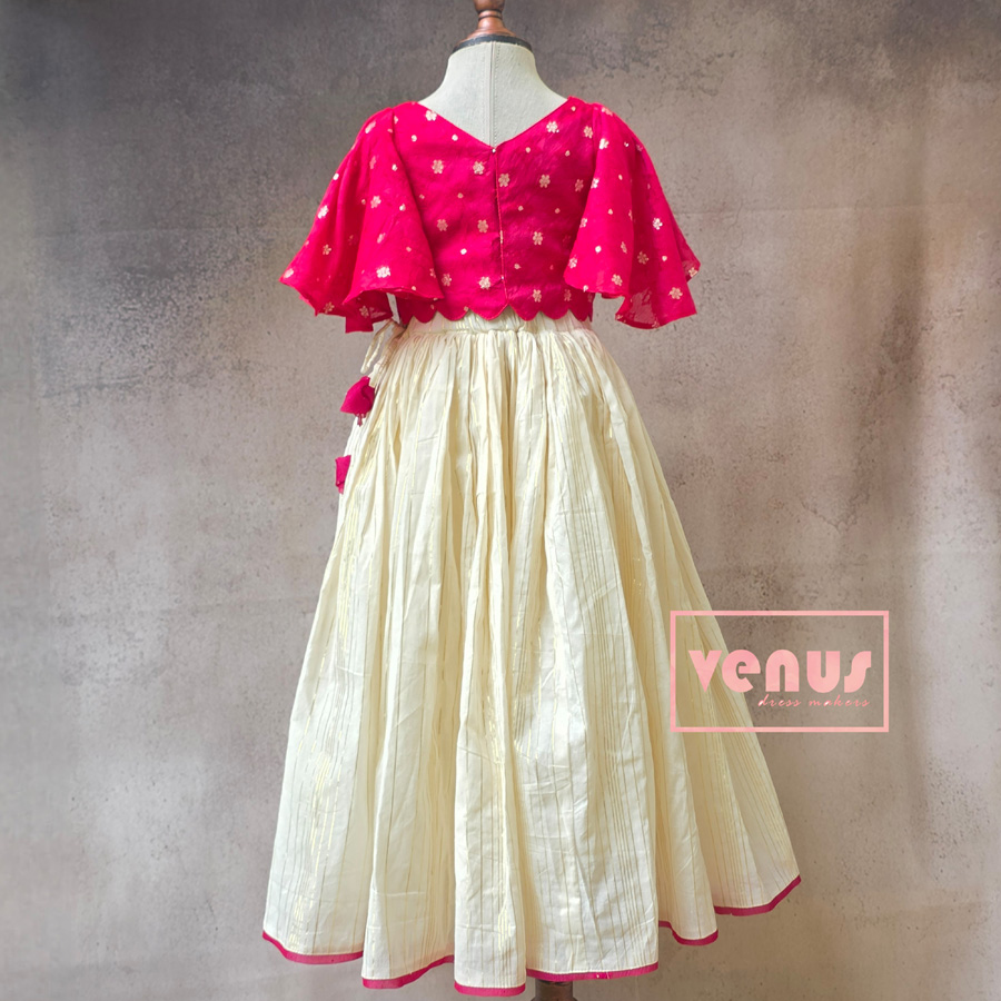 “Pavizhamalli” is a graceful blend of tradition and charm — featuring a rani pink Chanderi top adorned with delicate details, paired with a flowing cream skirt woven with subtle gold stripes. As soft and radiant as the night jasmine, this ensemble brings festive elegance to every little twirl.