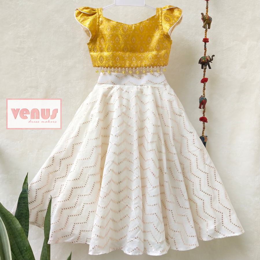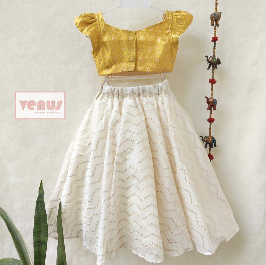 Skirt: Cream Chanderi fabric, Umbrella Style, Waist: Hook and Elastic