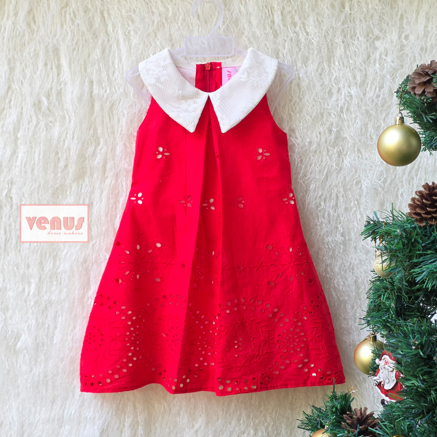 “Bless — a charming red dress sprinkled with delicate eyelet details and finished with a crisp white collar, made to brighten your little one’s Christmas moments.”