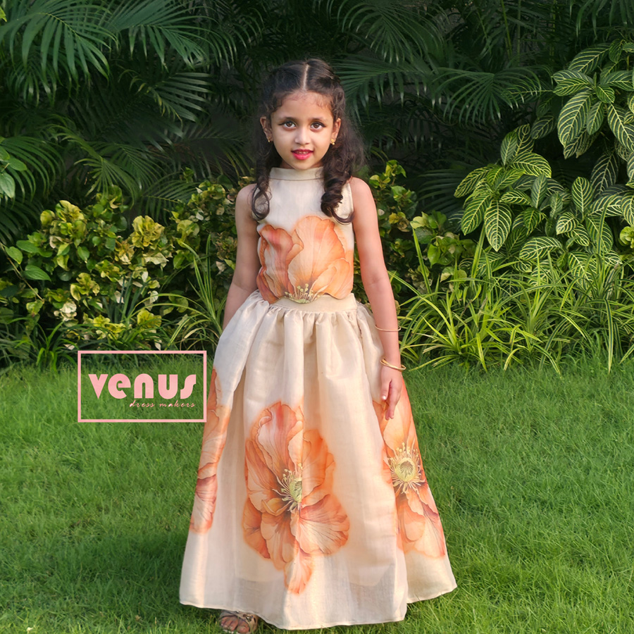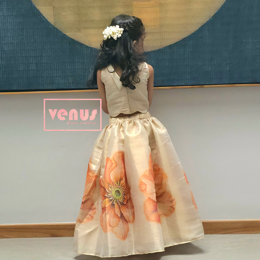 A graceful Kanak skirt and top set in warm golden tones, adorned with bold floral prints. Designed with a chic turtle neck pattern and crafted in rich gold tissue fabric, it blends elegance with festive charm—perfect for bright, joyful celebrations 🌼✨