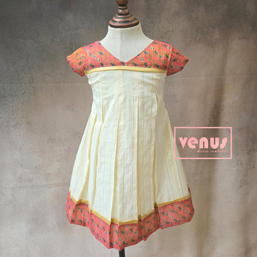 Vennilaa – A charming cream-colored A-line dress with cap sleeves, adorned with elegant box pleats, subtle gold lines, and a soft pink tissue border. A graceful blend of tradition and sweetness, perfect for festive occasions like Onam.