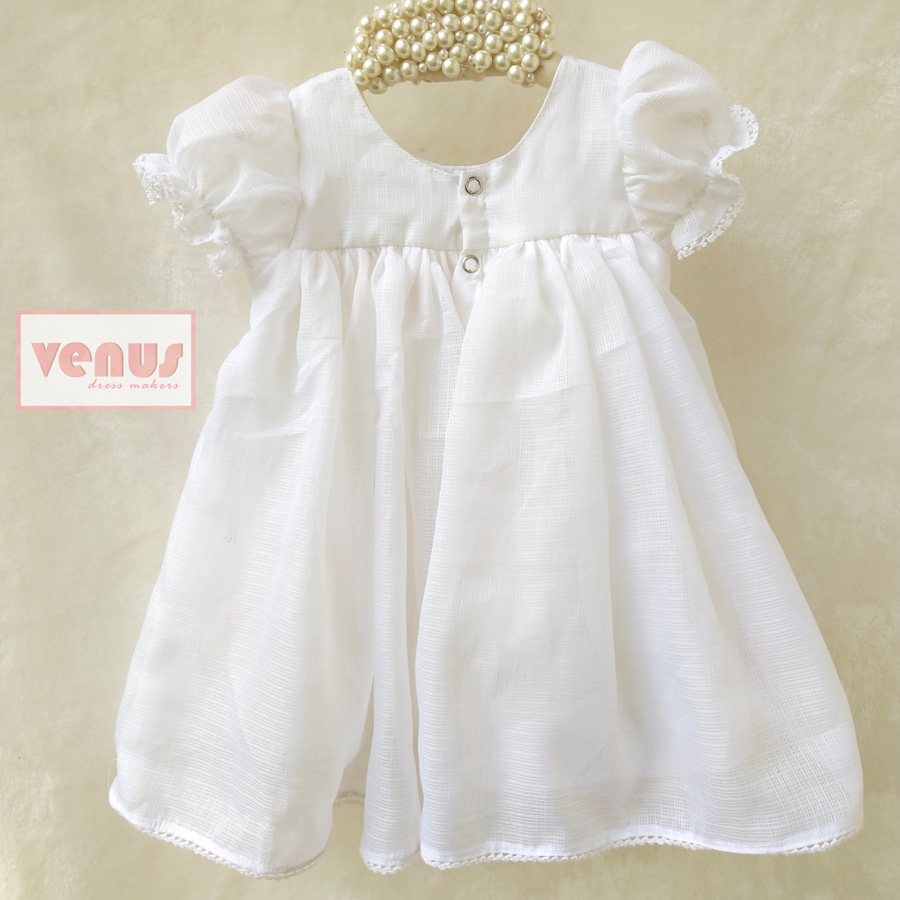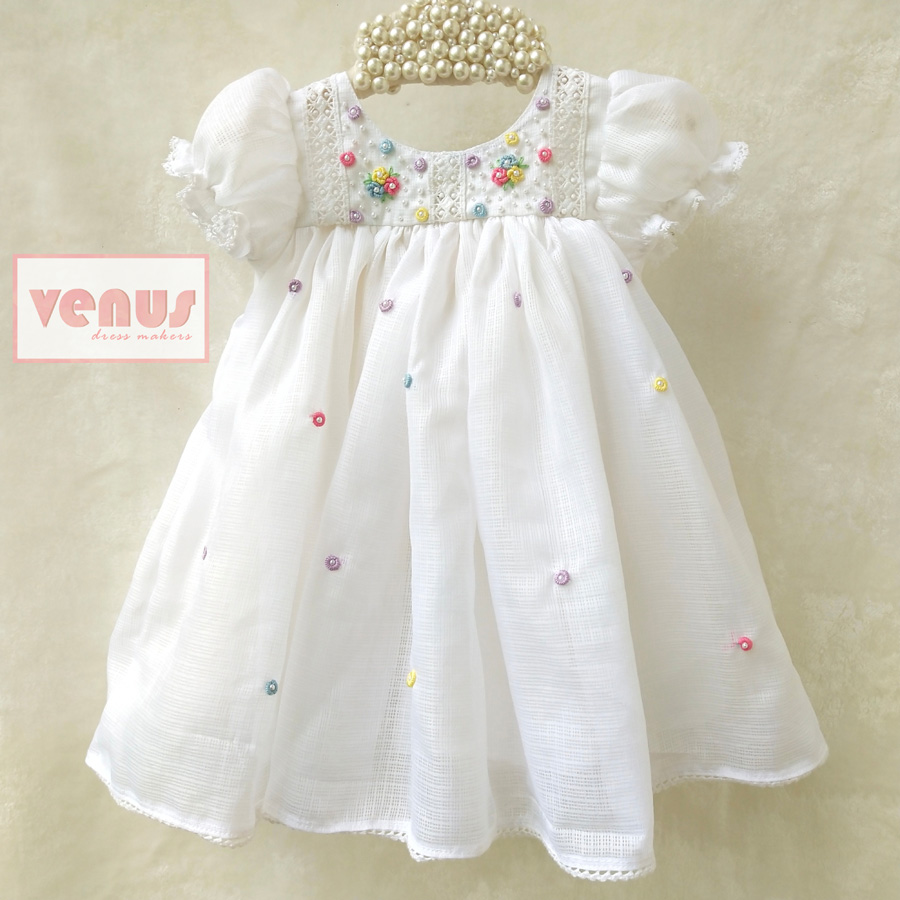 Delicate white dress with multicolor embroidery, symbolizing purity, innocence, and joy.